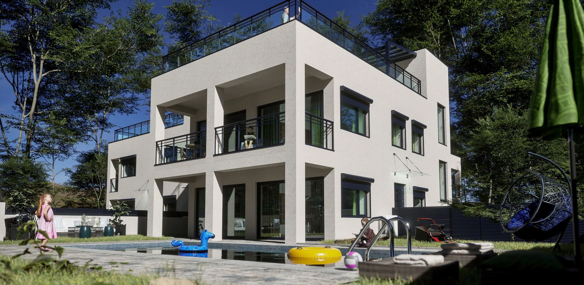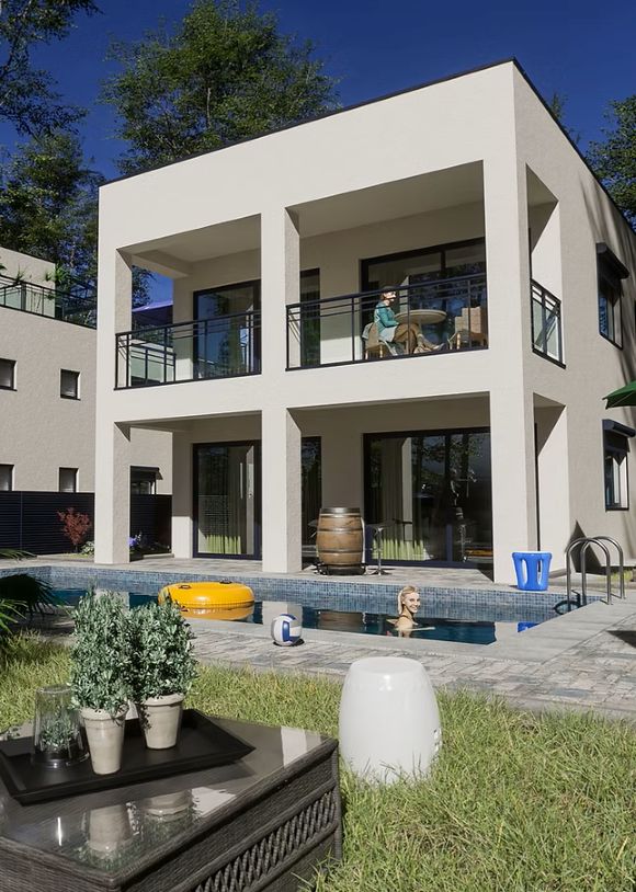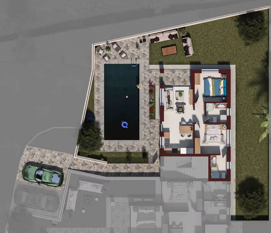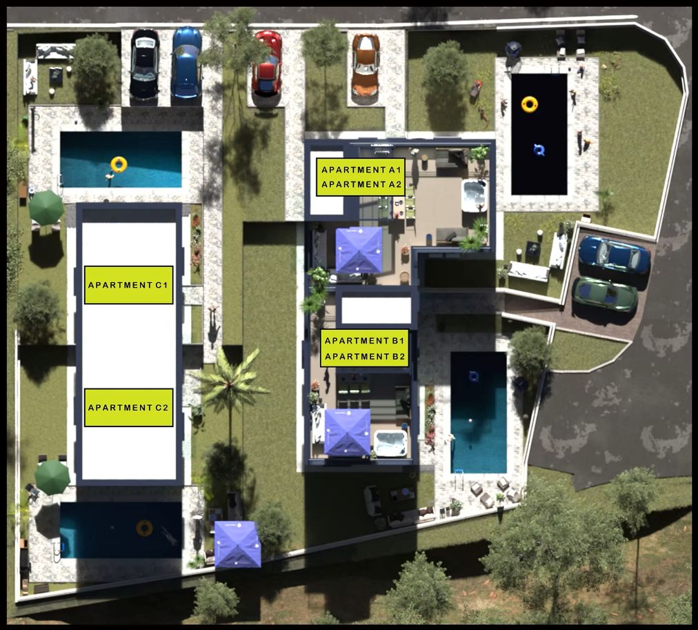 Das Projekt besteht aus 6 Luxuswohnungen, die auf 3 separate Gebäude verteilt sind. Der erste und zweite Gebäudeblock bestehen aus Erdgeschosswohnungen mit privaten, großzügigen Gärten, in denen der zukünftige Eigentümer genügend Platz hat, um eigene 4×8 m große Swimmingpools zu bauen.